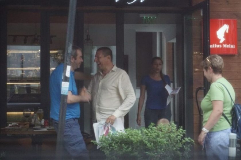 Снимка на Пепи Еврото с Борислав Сарафов, направена пред " Осемте джуджета " преди 3 година За нея Сарафов твърди, че е бил поканен в ресторанта от Иван Гешев, с цел да бъде скрито сниман и " приготвен ".