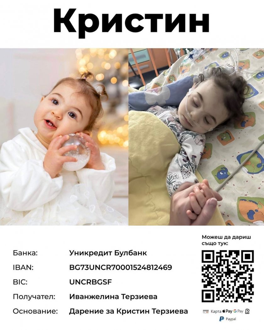 " Говорих до момента с майката на бебчето Ива и тя ми показа, че през днешния ден Кристин още веднъж е имала припадък. Както ви споделих нощес, бебчето се намира в Трета градска болница в София. В момента се пробват да уредят документите за неотложно превозване на дребната незабавно щом се събере сумата от 500 000 лева!!