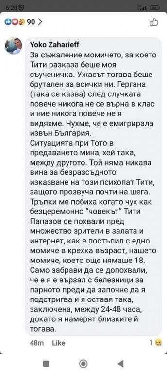Певицата Йоана Захариева-Йоко направи разкрития по отношение на случая с някогашната другарка на Тити Папазов, чиято коса той обръснал. Тя написа коментар в обществените мрежи, в който показа, че въпросното момиче е било нейна съученичка, казвала се Гергана.