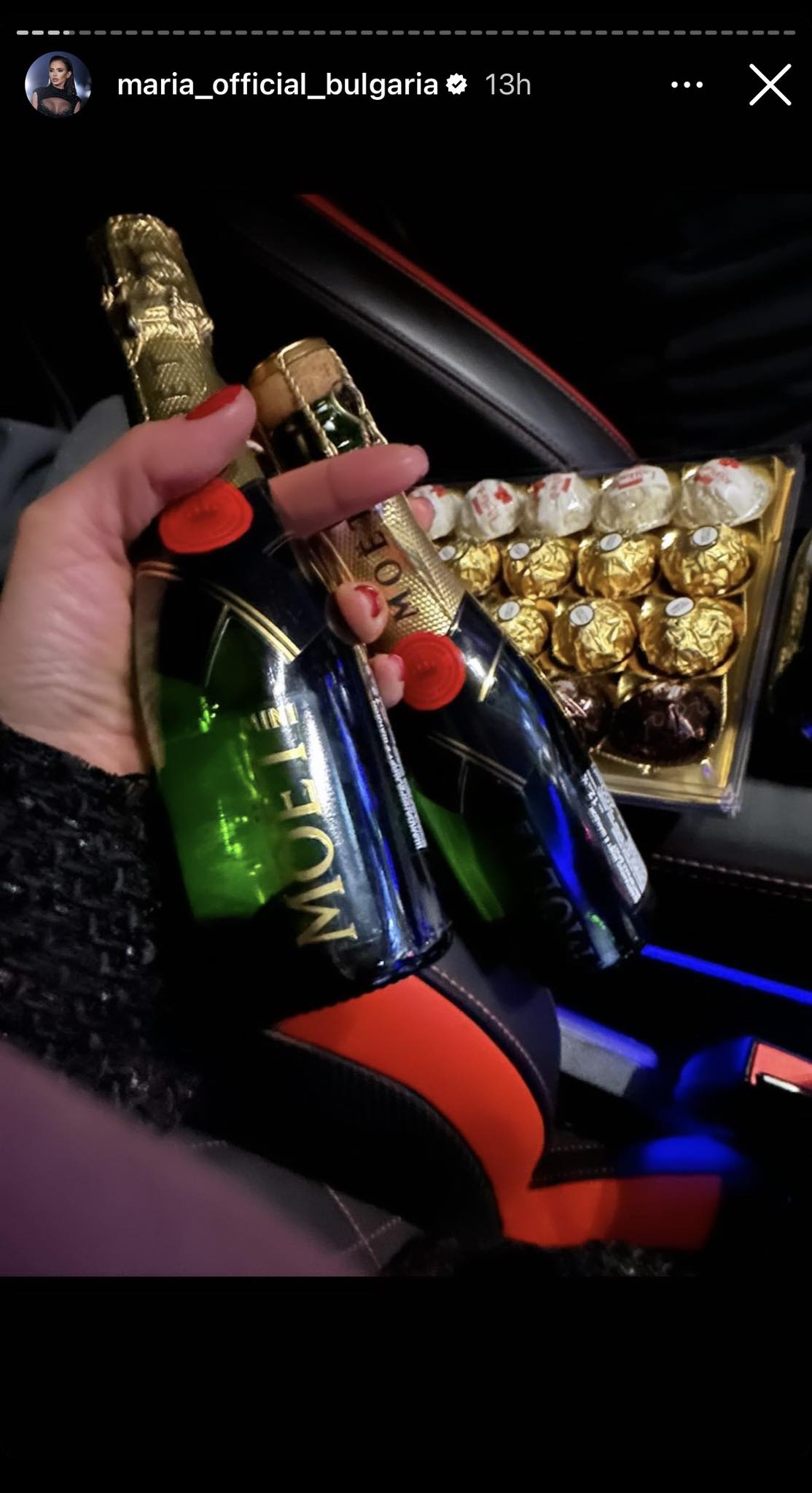 Мария показа фрагменти от обилна заря, която озарява небето над малко градче, през което минава тъкмо в среднощ. Отварачката се е подготвила да посрещне новата година не измежду другари, а на път. Малко преди часовникът да удари 0 часа и да стартира новата година, тя сподели по какъв начин в ръце държи скъпо шампанско. И щом настава 2024-та отваря питието и подвига тост с обичания си Мирослав.