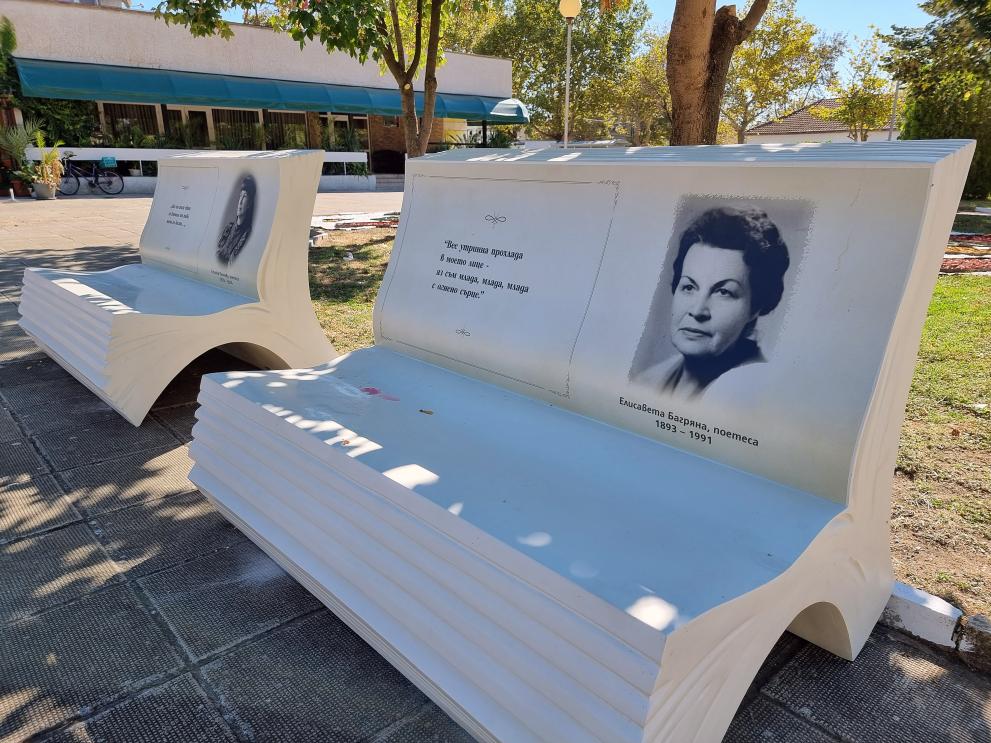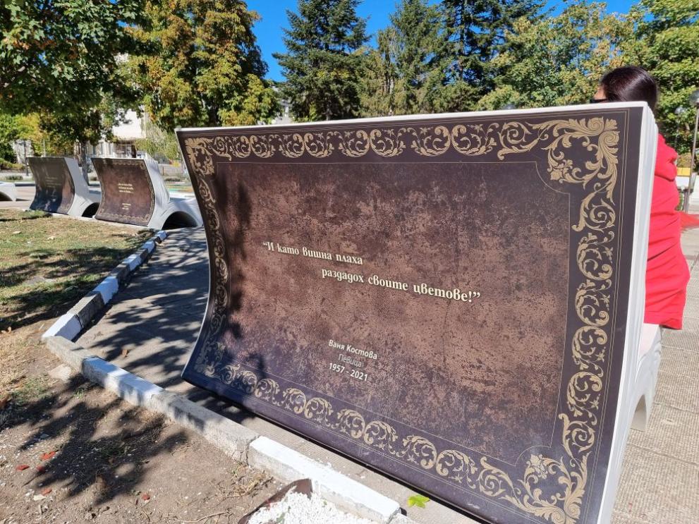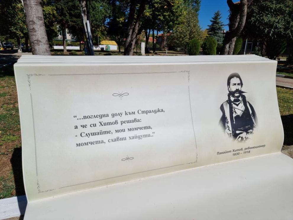Българска телеграфна агенция Пейките са с ликовете на революционери и поети, а на тях са изписани къси стихове и цитати. Осемте „ пейки-книги “ са с войводите Панайот Хитов и Стефан Караджа, поетът и бунтовник Пейо Яворов, поетесите Елисавета Багряна и Станка Пенчева, националната певица Вълкана Стоянова, хореографът Тончо Тончев и певицата Ваня Костова.