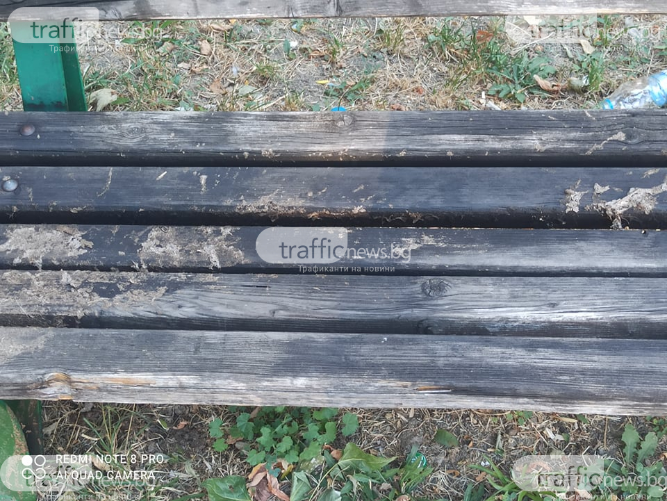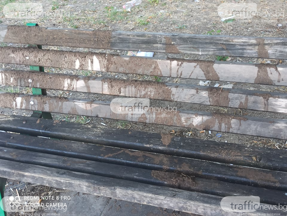 В зелените площи се захвърлят и цели торби с битов боклук. Пейките постоянно се чупят. За последно са ремонтирани този януари, когато са били заменени 15 дъски. Неизвестни лица обаче постоянно ги цапат. Предишният път са били обсипани с машинно масло, а в този момент се оказва, че са намазани с оборска тор.