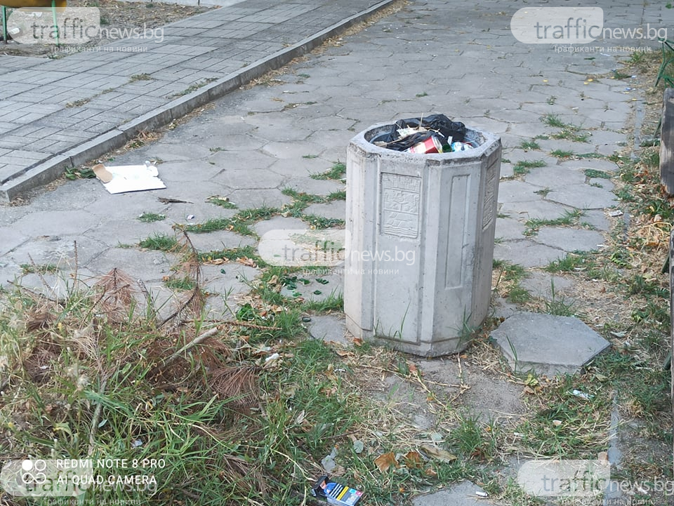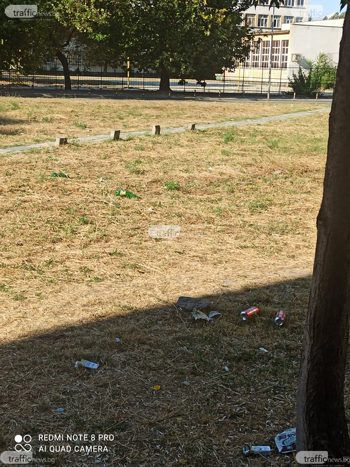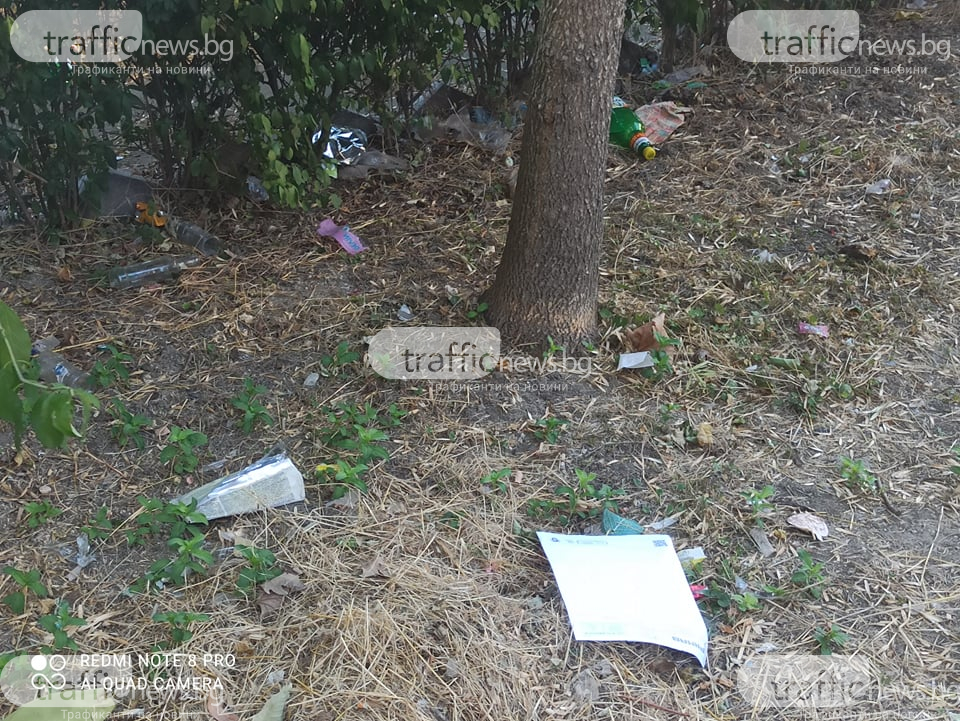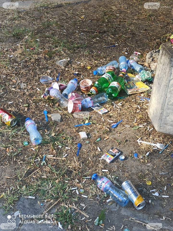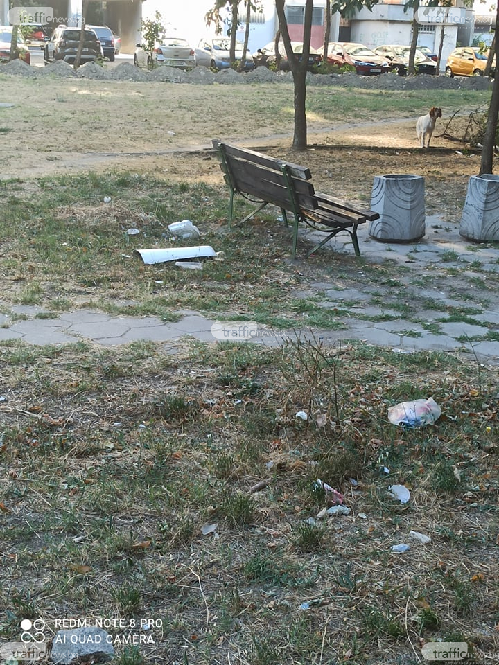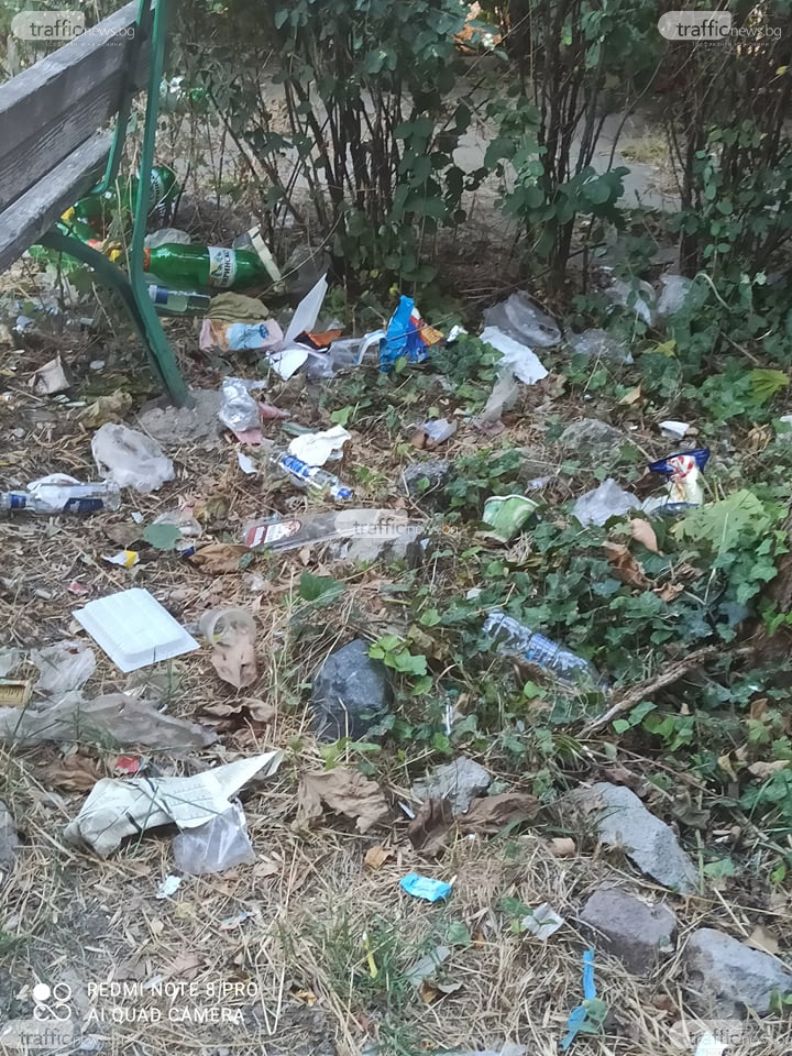 Читатели подозират, че поданици от близката махала се събират вечер в градинката и оставят отпадък след себе си, който живущите от блоковете са принудени да разчистват сами.
