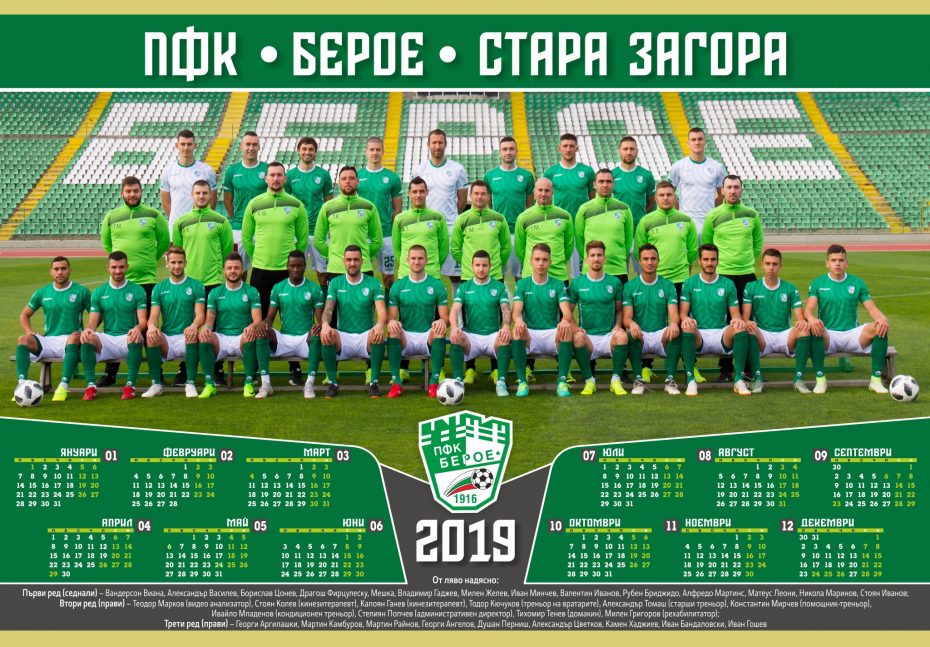ПФК Берое пуска в продажба формалните календари на отбора за 2019 година Всички почитатели и колекционери ще могат да си ги закупят единствено в формалния почитател магазин на клуба, който се намира на стадион „ Берое “. Магазинът работи от вторник до събота (14:30 – 19 ч.). Почивни дни – неделя и понеделник. Когато има мач на „ Берое “ е отворен най-малко два часа преди мача и до момента в който има хора на стадиона след последния съдийски сигнал. И тази година се оферират три разновидността на календари – „ общоприет “ (еднолистов), „ работен “ (с три секции и датник) и вид „ пирамида “ (за бюро).