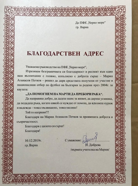 ПФК Черно море получи признателен адрес по впечатляващ мотив. Младият гений от академията на “моряците ” Марин Атанасов подари средствата, получени от националния тим на България за родени 2004 година, за благотворителна самодейност – “Да помогнем на Марти да пребори рака ”.