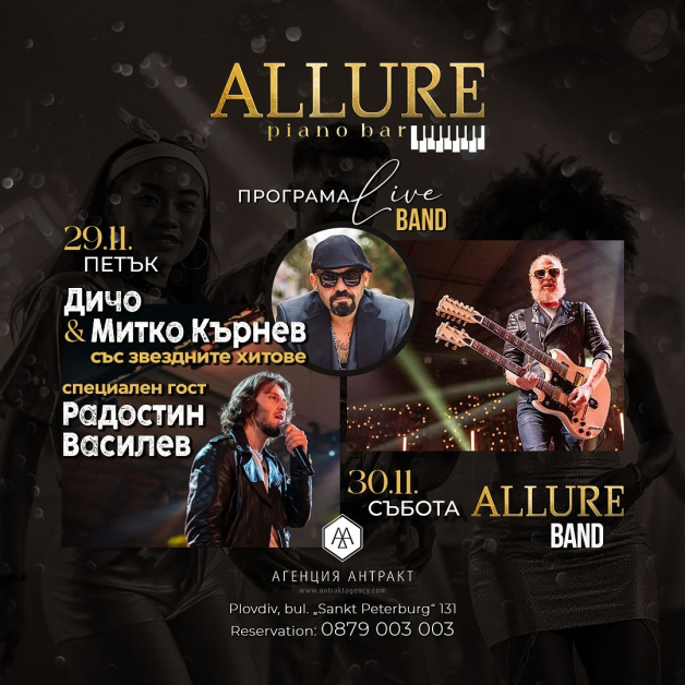 Пиано бар Allure в Пловдив ще бъде хазаин на особено музикално събитие, което дава обещание да впечатли всички фенове на българската рок и поп сцена. За този концерт, двама от най-емблематичните музиканти на актуалната българска музика – Дичо и Митко Кърнев , ще се качат на сцената на барa в петък /29 ноември/ . Специалният посетител Радостин Василев ще добави още страст и магия към атмосферата. Пиано барът отваря порти в 21:00 часа, а музикантите ще започват осъществяванията си в 22:30 часа.