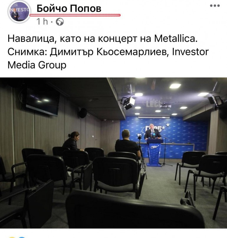 Пиарът на партия ГЕРБ Никола Николов сподели по какъв начин се продуцира подправена вест у нас. Става дума за брифинга, който даде през днешния ден Бойко Борисов от централата на партията. Според непосредствен другар на екоминистърa Борислав Сандов, Бойчо Попов за изявлението на Борисов освен не е имало медии, само че и това били последните останки от партията. На фотографията пусната от Попов е снимана единствено една дребна част от залата.