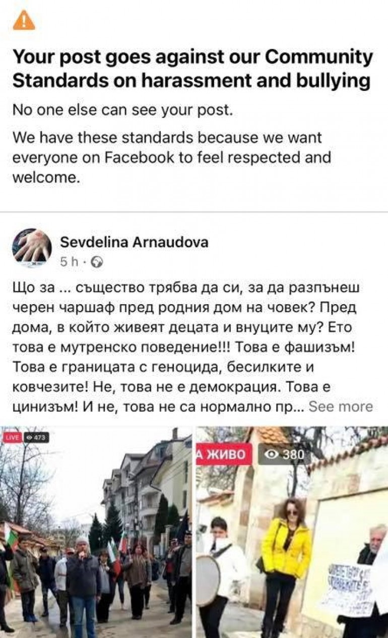 Пиарката на ГЕРБ Севдалина Арнаудова падна жертва на цензурата в обществените мрежи. Неин пост беше свален от Facebook след проведена акция по всеобщо докладване за тормоз. Тя сама заяви за събитията към изтрития пост с нова обява.