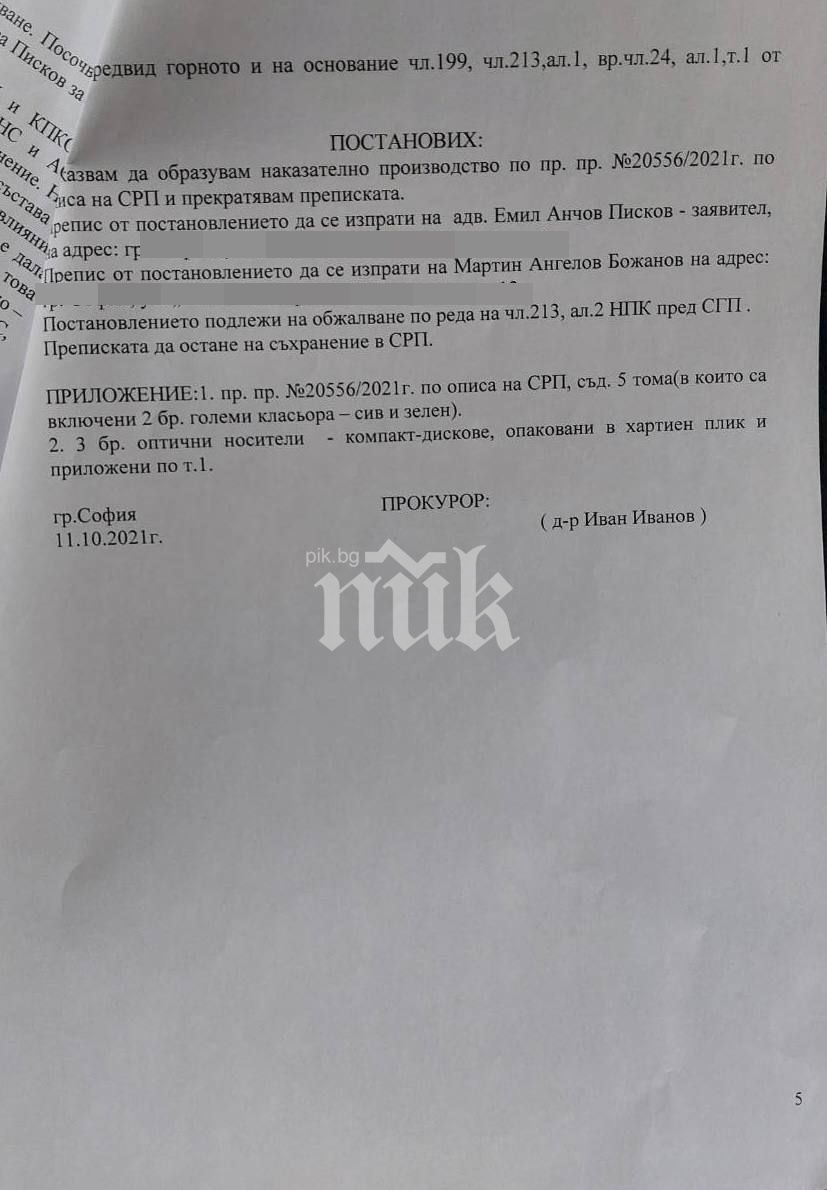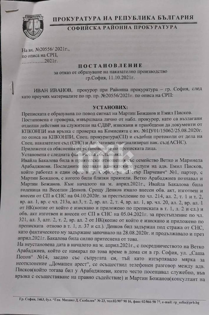 ПИК се снабди с разпореждане на Софийска районна прокуратура от 11.10.2021 година за отвод от формиране на наказателно произвеждане против Ивайла Бакалова от страна на прокурор Иван Иванов.