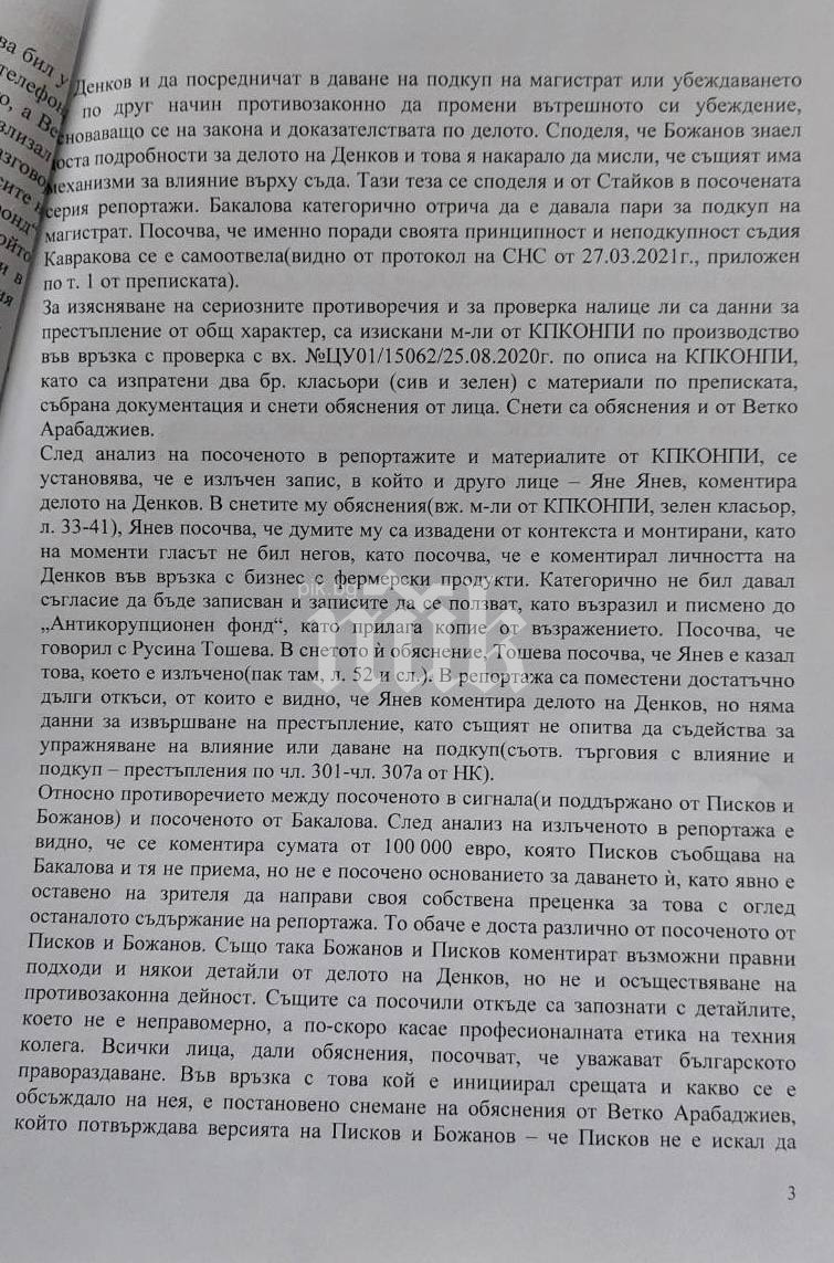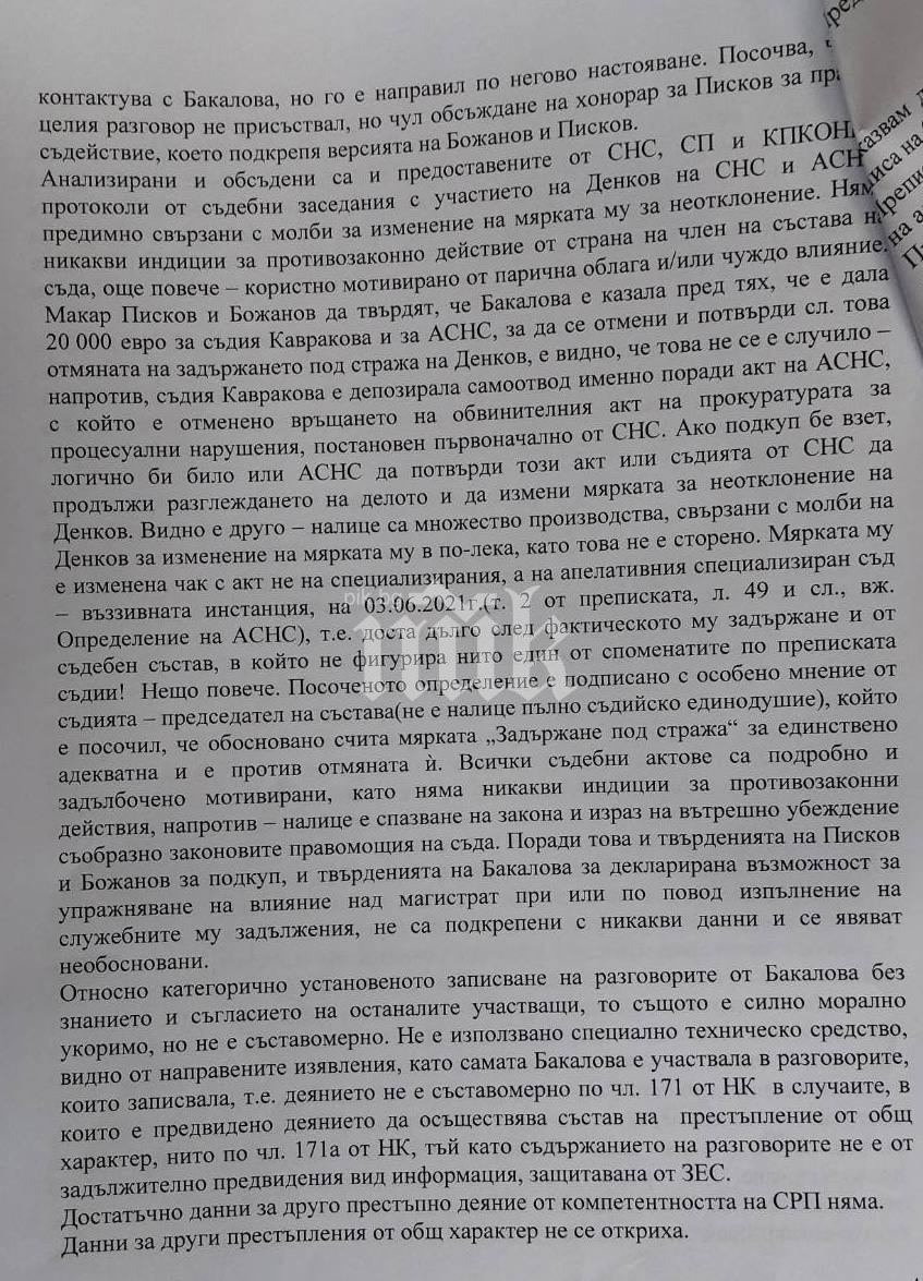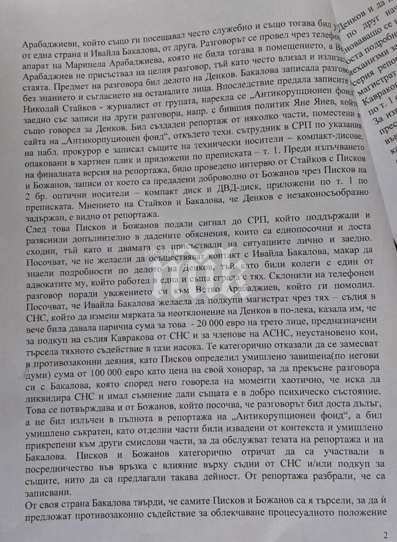 Посочват, че Ивайла Бакалова желаела да подкупи магистрат посредством тях - арбитър от Специализирания углавен съд, който да промени мярката за неотклонение на арестувания в ареста Денков; споделила им, че към този момент е дала 20 000 евро на трето лице, предопределени за рушвет на арбитър Кавракова от СНС и за членове на АСНС, неустановено кои. Те изрично отказали да се замесват в незаконни действия, а пък Писков съзнателно бил завишил сумата на 100 000 евро като цена за своя хонорар, с цел да прекъсне диалога си с Бакалова, написа в отхвърли на прокурор Иванов.