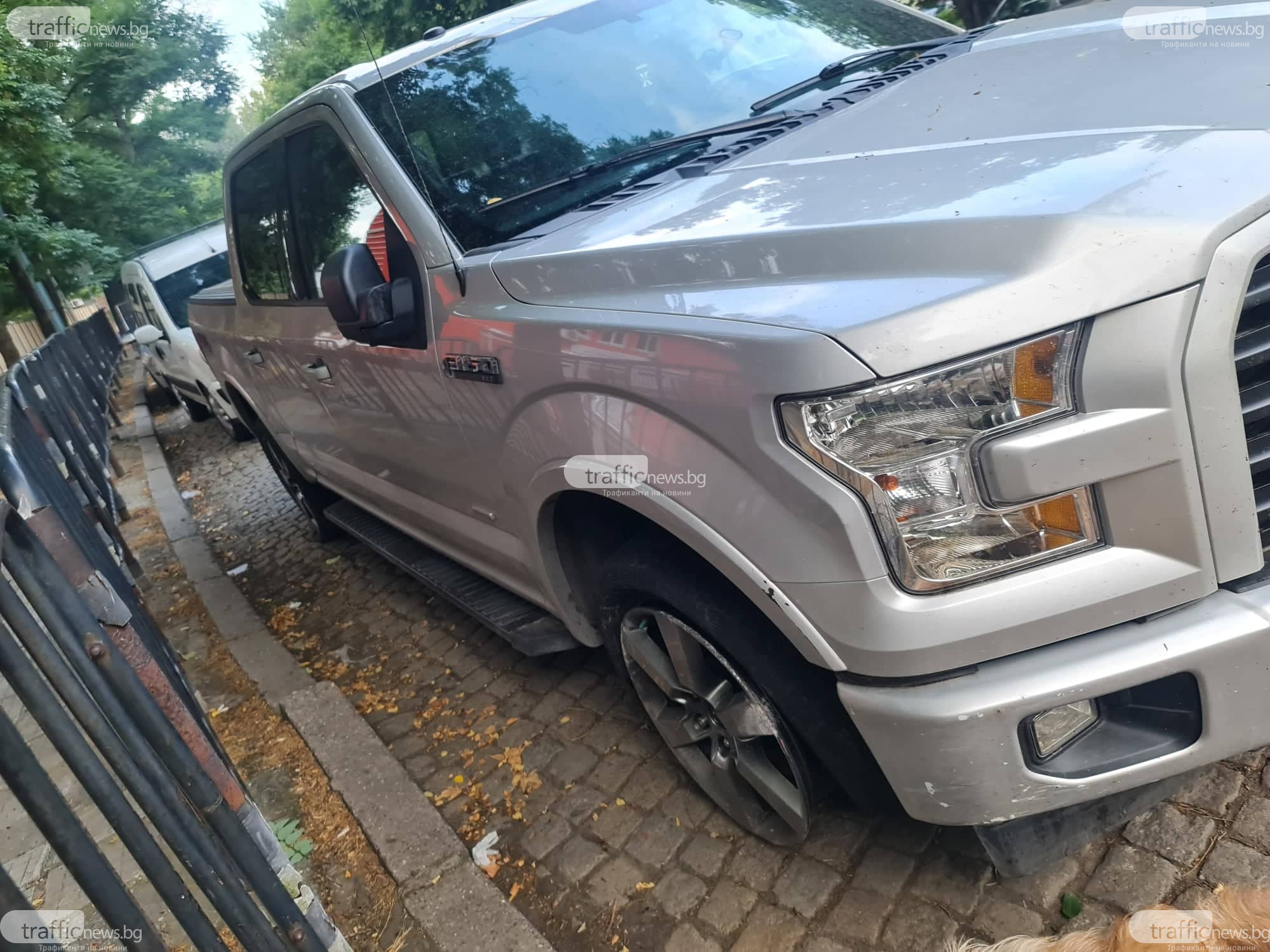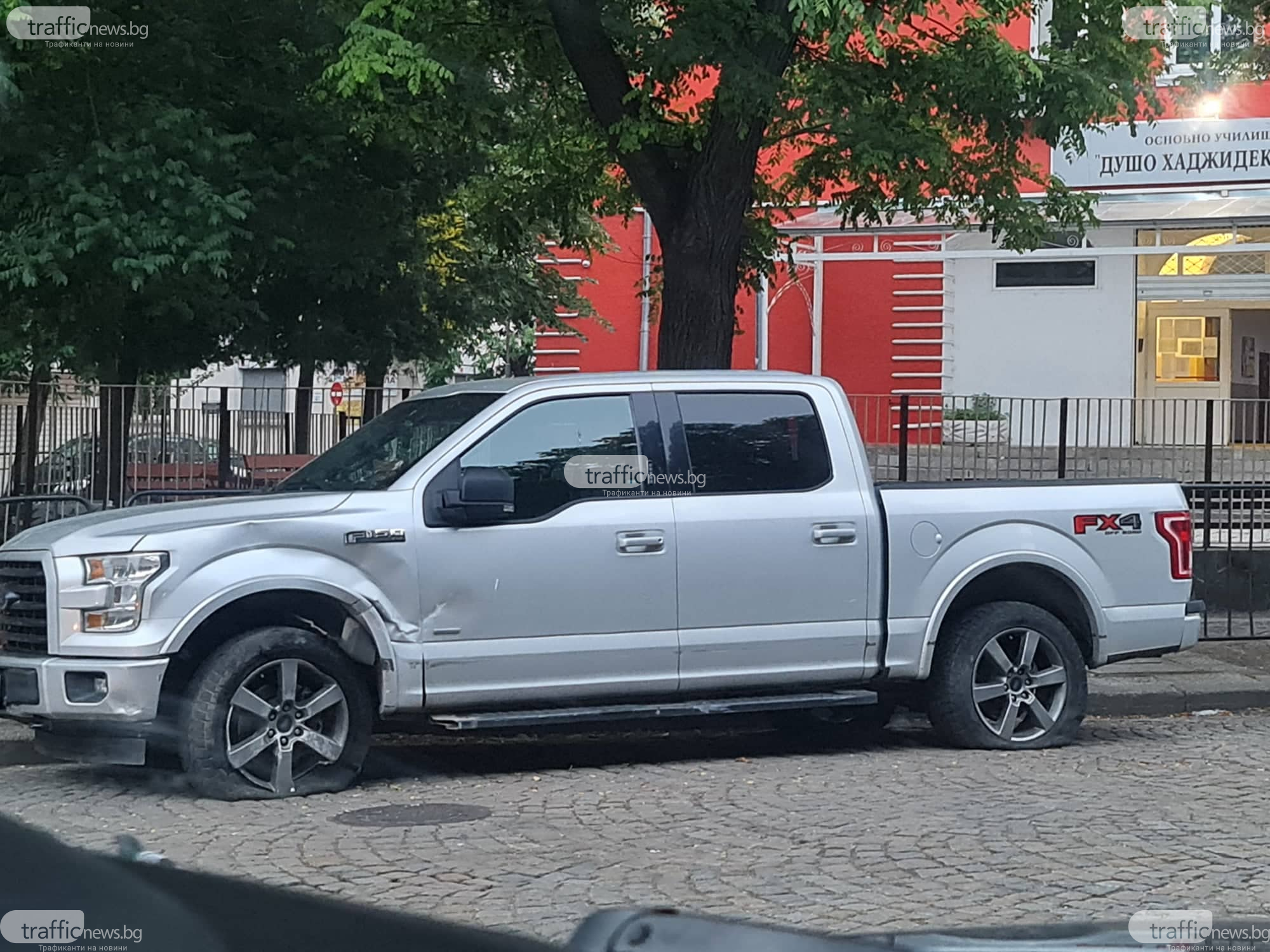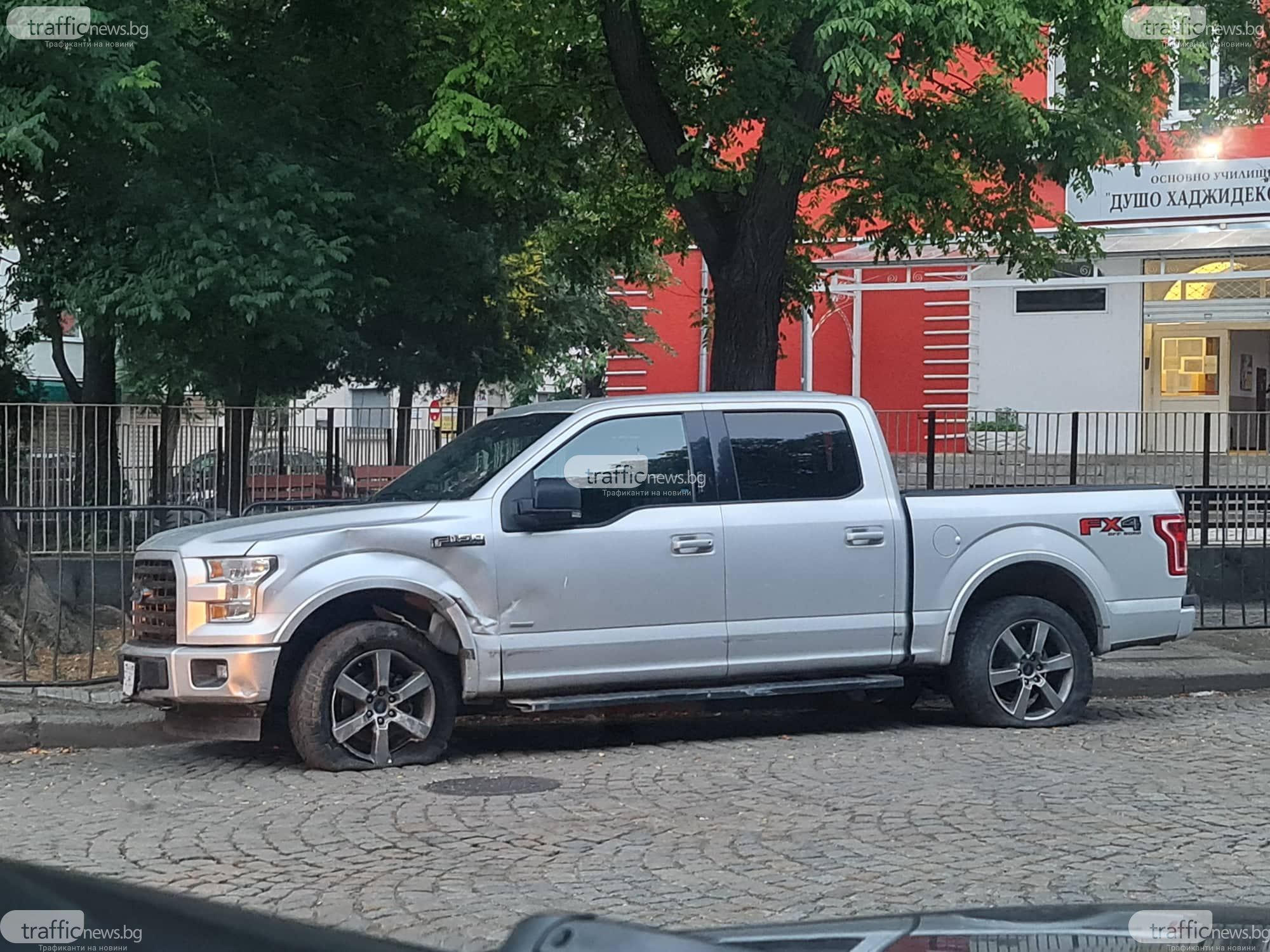 Пикап с четири спукани гуми, помлени джанти и очевидно ударен, е паркиран пред ОУ " Душо Хаджидеков " в центъра на Пловдив. Пловдивчани настояват, че първокласното возило е там от няколко дни.