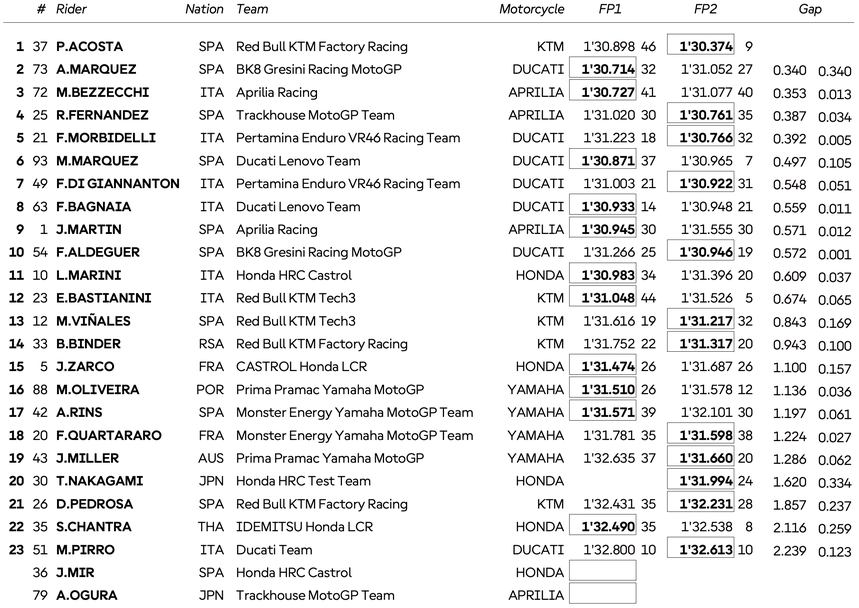 Лидерът в генералното класиране в MotoGP Марк Маркес приключи теста на шестата позиция на 0.497 от първото място с обиколката си от утринната сесия. Неговият съотборник Франческо Баная остана осми на 0.559 от Акоста, откакто направи едно леко рухване в шестия завой в границите на следобедната сесия. Двамата водачи на Дукати бяха разграничени от Фабио Ди Джанантонио, който изпревари Баная с 0.011.