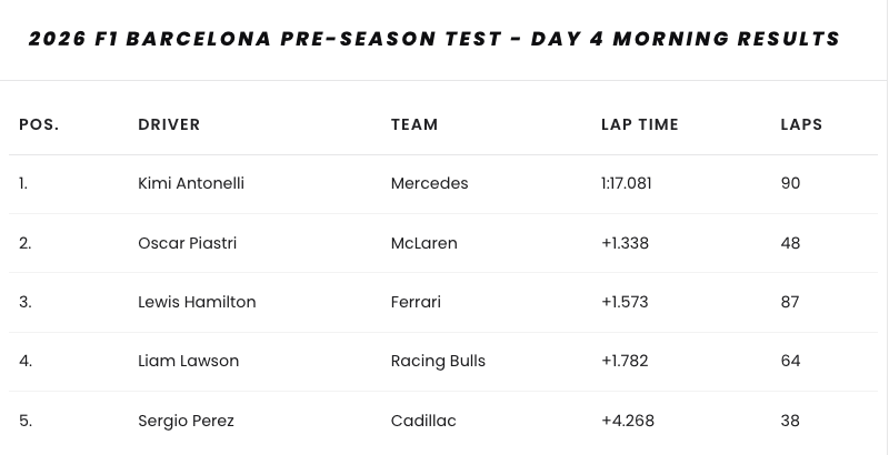 Пилотът на Мерцедес Андреа Кими Антонели зададе темпото в четвъртата сутринта на шейкдауна преди началото на формалните проби във Формула 1 през 2026 година.