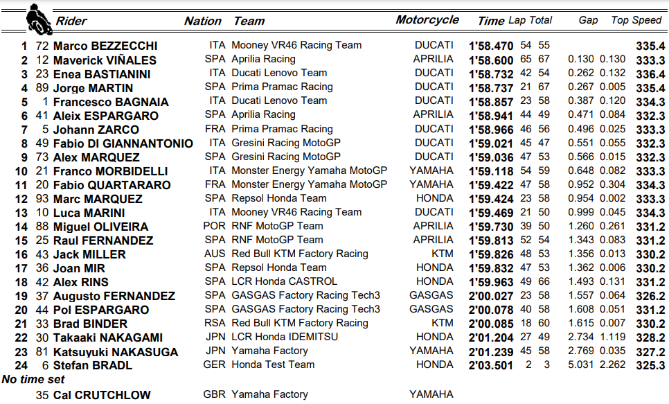 С нея той съумя да победи с 0.130 секунди водача на Априлия Маверик Винялес, който направи цели 67 обиколки на трасето край Куала Лумпур. С толкоз приключи и водачът на Прамак Дукати Хорхе Мартин, като двамата бяха най-активните състезатели в границите на днешния ден на тествания. Мартин зае 4-то място в класирането с пасив от 0.267 секунди по отношение на водача Бедзеки.