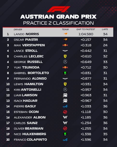 В рамките на втория час за подготовка на „ Ред Бул Ринг “ Норис, който пропусна утринната подготовка за сметка на Алекс Дън, завъртя обиколка за 1:04.580, с която изпревари с 0.157 секунди своя съотборник Пиастри. Трети с пасив от 0.318 остана Макс Верстапен, който беше единственият различен водач, слязал под 1:05 за обиколка.