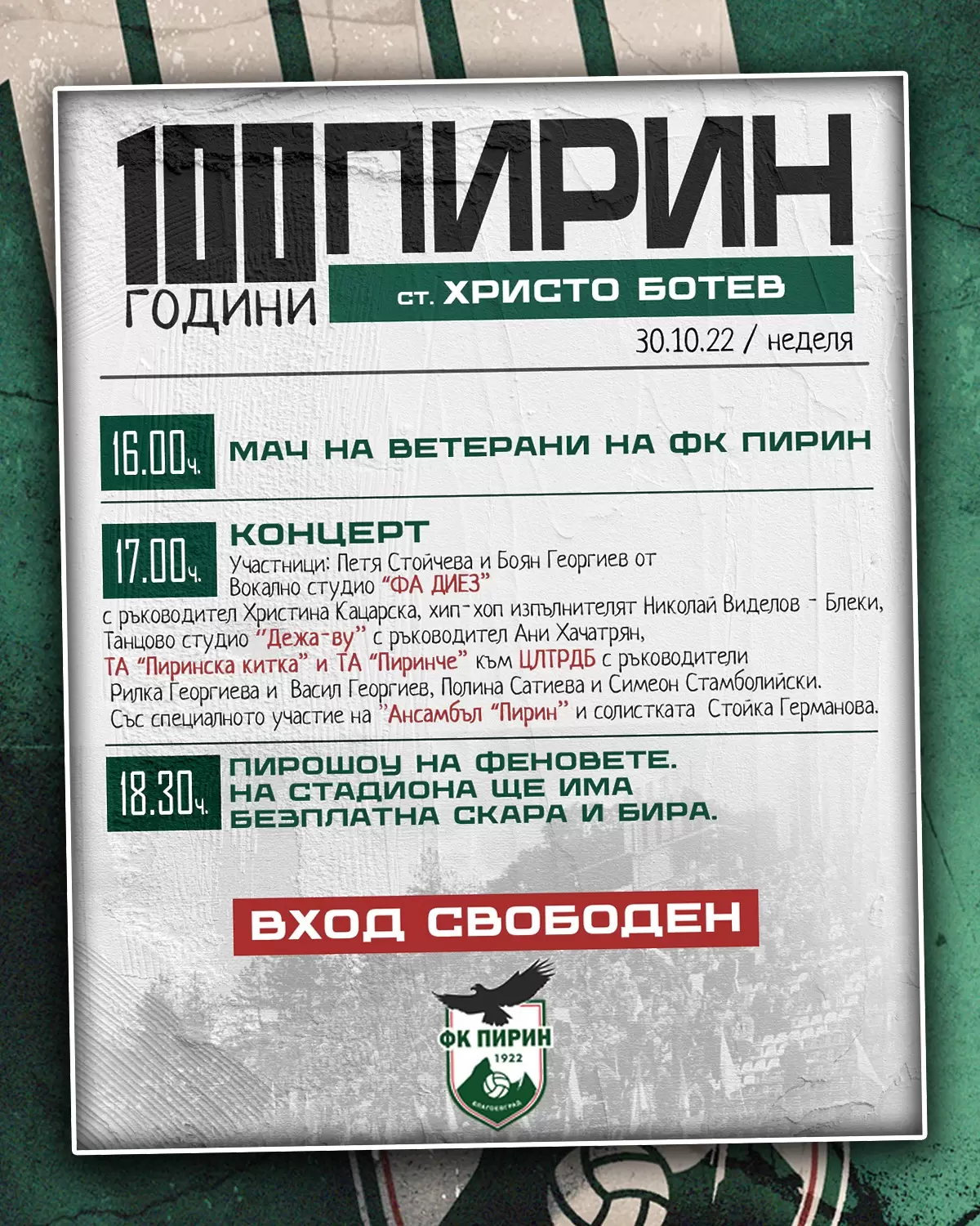 Пирин Благоевград разгласи програмата за празненствата, проведени от почитателите по случай 100-годишнината на клуба.
