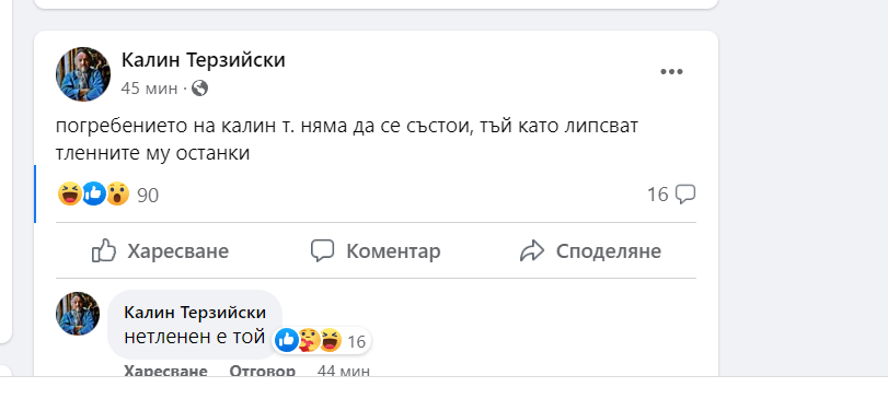 Писателят Калин Терзийски реши, че към този момент е починал и написа: „ погребението на калин т. няма да се състои, защото липсват тленните му остатъци ”, видя Lupa.bg.