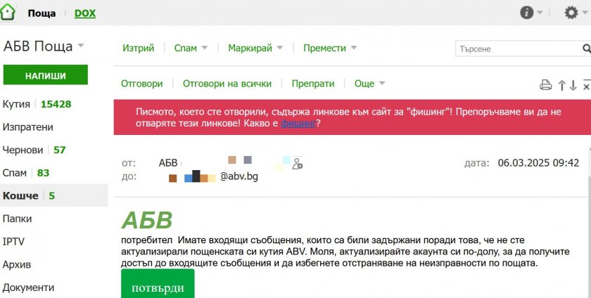 Атакуват ни с линкове най-много в ABV.bg, на които да се излъжем да чукнем. Използват се както банки, в които даже може да нямате сметки, по този начин и идват писма, представящи се за ABV.bg, Фейсбук и какво ли още не.