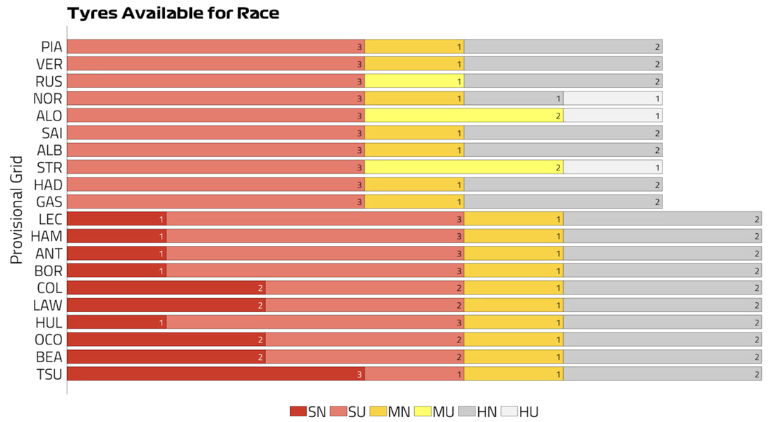 Абсолютно всички водачи, като се изключи тези на Астън Мартин и Ландо Норис, разполагат с по два комплекта чисто нови твърди гуми за надпреварата. Норис също има два комплекта, само че с единия от тях той направи една инсталационна обиколка във вчерашната подготовка. Фернандо Алонсо и Ланс Строл имат по един комплект към този момент карани твърди гуми, само че за разлика от всички останали те имат два комплекта от приблизително твърдите смеси, които обаче към този момент са употребявани в квалификацията. Джордж Ръсел също употребява единственията си чифт приблизително твърди гуми в квалификацията през вчерашния ден, а за всички останалите водачи има единствено чисто нови приблизително твърди гуми.