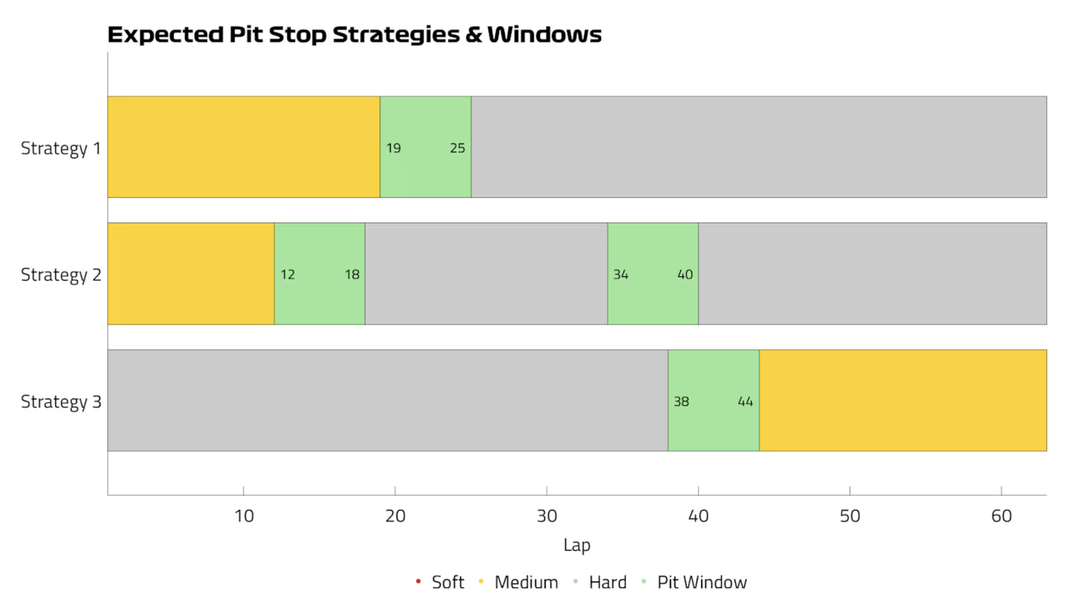 Алтернативно водачите от дъното на стартовата решетка могат да заложат на по-дълъг първи стинт с твърдата примес. В този случай прозорецът за прекъсване в бокса и прекосяване към приблизително твърдите сликове е сред обиколки 38 и 44. Теоретично съществува разновидността за по-агресивна тактика с две прекъсвания в бокса и потреблението на два комплекта твърди гуми. В този случай стартът още веднъж е със приблизително твърдите, първото прекъсване в бокса е по-ранно (12-18 обиколка), а второто идва сред обиколки 34 и 40.