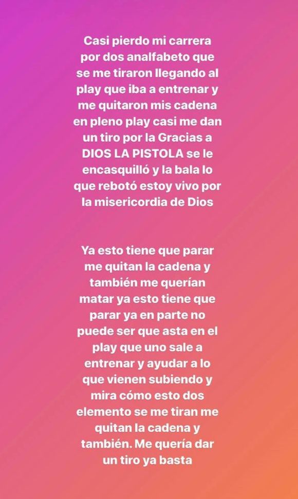 " Слава богу, че револверът им засече. Жив съм единствено с помощта на милостта на Господ – написа @castromiguel46 на испански в своя профил в обществената мрежа. – Това би трябвало да спре. Взеха ми ланеца и желаеха да ме убият. Това е необикновено. Бях на път към подготвителното игрище, с цел да оказвам помощ на тези, които желаят да пробият във Висшата лига, а тези двамата ми се нахвърлиха, ограбиха ме и имаха желание да ми пуснат патрон. Това би трябвало да спре. "