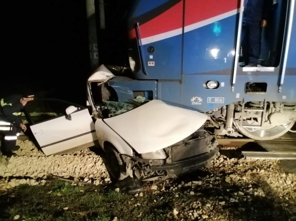 Пиян водач съумя да се измъкне от колата си преди да я смаже трен. Инцидентът е станал малко след 01:30 часа тази нощ на жп гарата край село Велино.