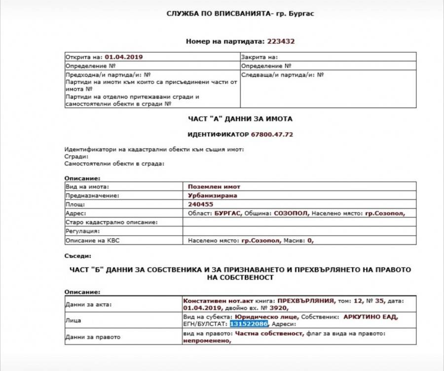 Съгласно информация от Службата по вписванията в Бургас, до 1 април тази година " Аркутино " ЕАД още не е бил притежател на въпросния парцел. Само че на 1 април към този момент има прекачване.
