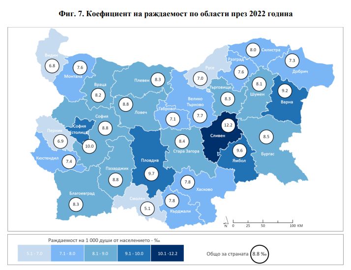 В двадесет области раждаемостта е по-ниска от междинната за страната, като най-ниски стойности се следят в Смолян - 5.1‰, Видин - 6.8‰, и Перник - 6.9‰.