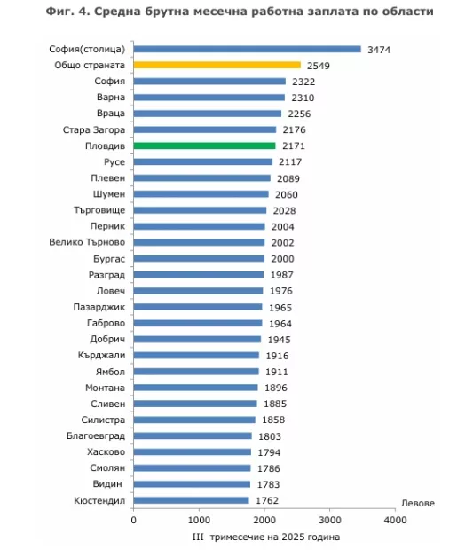 На този декор Пловдив заема шесто място по равнище на заплатите в България. Средните приходи в региона остават с към 378 лева по-ниски от тези за страната, които доближават 2549 лева Разликата със София обаче остава осезаема – в столицата междинната заплата е 3474 лв. , което е с над 1300 лв. повече от пловдивската.