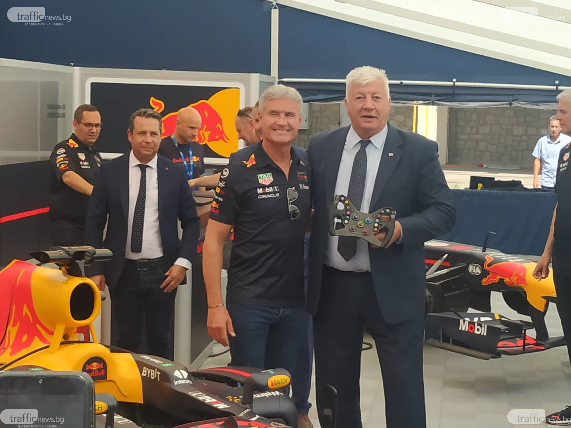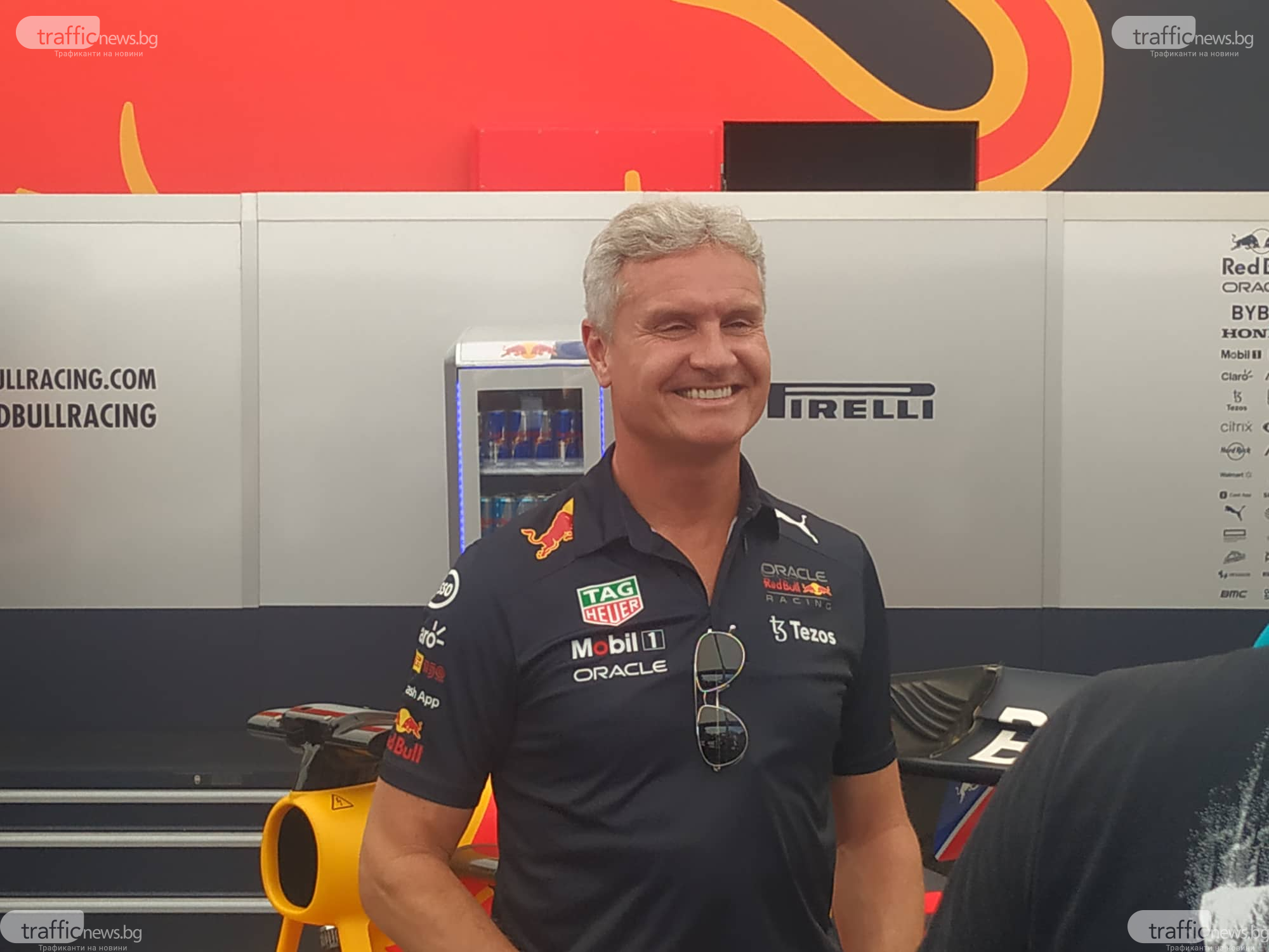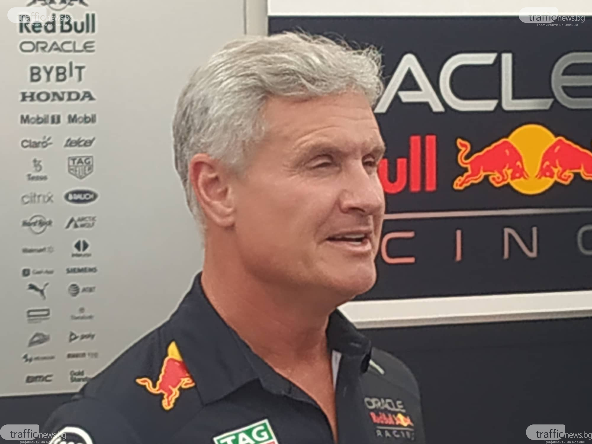 Дейвид Култард предложения Здравко Димитров в тийм Red Bull по време на съревнование от Формула 1.