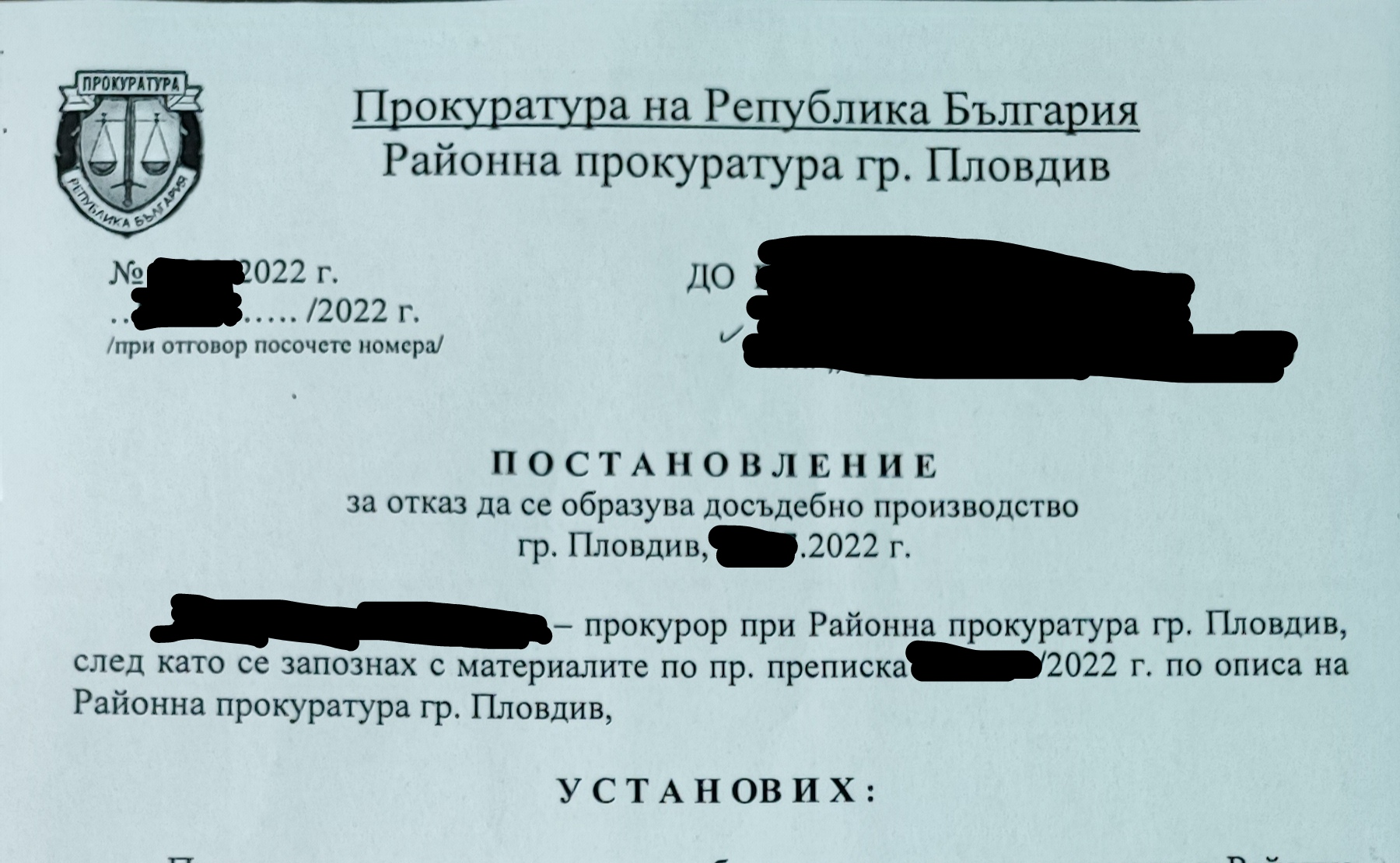 Предвид това, че няма осъществено закононарушение от общ темперамент, а от частен подобен, прокуратурата се е отказала да образува досъдебно произвеждане по съответния случай.