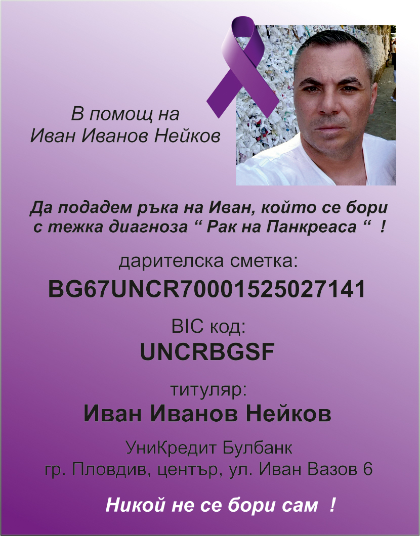 " Най-коварната болест се промъкна и в нашия дом. Появи се незабелязано като змия- безшумна и отровна, с цел да се настани нападателно в тялото на брачна половинка ми Иван. Иван е един от вас, татко на две деца, който с любов и почтен труд обгрижваше фамилията ни до неотдавна. Един обикновен обзор преди месец прекатурна целия ни свят. Диагнозата " Рак на панкреаса " бе шокът, който се стовари над домът ни ", написа брачната половинка му.