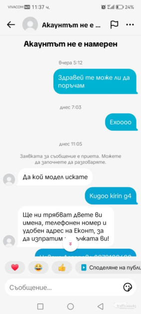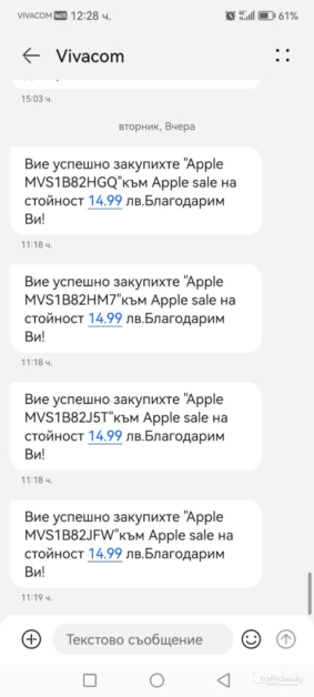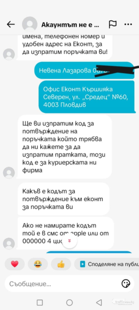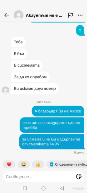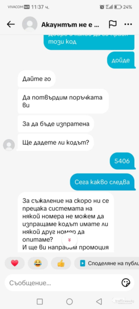 След по-малко от 2 минути ми дойдоха 4 SMS-a от оператора, който ме уведомява, че имам начислени 60 лв. върху сметката. Последва ново включване от продавача, който ми споделя, че системата им е блокирала. Ще получа нов код и отново да им го изпратя. Тогава се усетих, че е машинация и му написах, че ще се обърна към полиция и прокуратура. Комуникацията ни завърши, а профилът бе деактивиран ”, споделя пред наш кореспондент Невена.