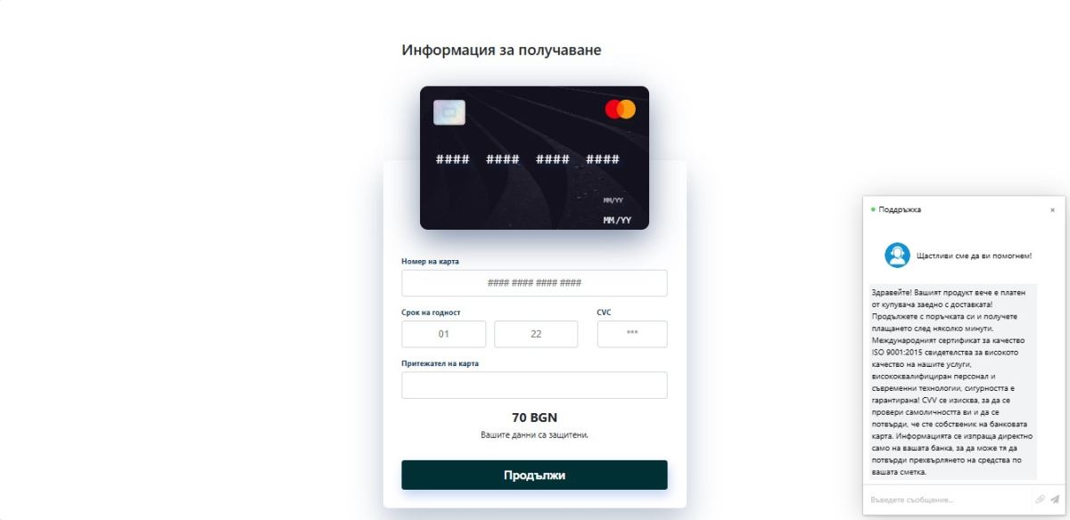 Тя се съгласила, като малко по-късно и е бил изпратен линк за персонализирана поръчка с поле, в което да вкара данните си на картата, с цел да и дават парите по сметката. Добавила, че откакто получи парите, с нея ще се свърже пощальон от компанията, с цел да каже адреса си и да покаже персоналната си карта, като в допълнение изпратила фотография на своята.