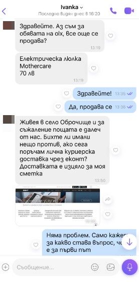 Пловдивчанка предизвести за онлайн машинация за източване на пари. Измамниците са употребявали фиктивно услуга на куриерска компания Еконт, като поискали номера на банковата карта. Жената описа, че е разгласила публикация за продажба на продукт в OLX, към който жена, представяща се за Иванка е показала интерес. Пловдивчанката е получила питане във вайбър от въпросната жена, дали продуктът е към момента разполагаем и се продава, като е поискала да и се изпрати посредством „ Лична куриерска доставка ” посредством Еконт, като доставката да бъде заплатена от нея онлайн авансово.