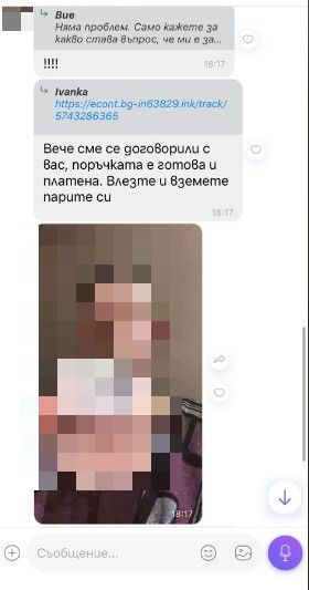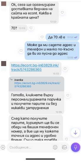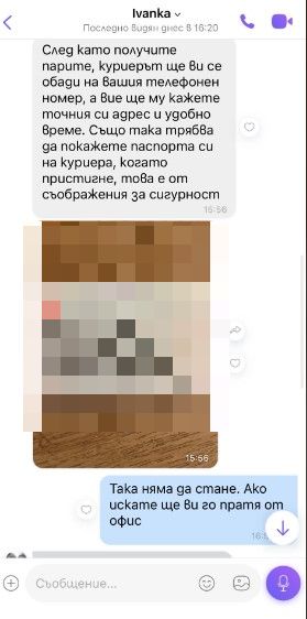 Тогава обаче дамата се усъмнила и разговаряла със чиновник на Еконт, който споделил, че нямат такава процедура. Пловдивчанката написала на дамата, че е разговаряла със чиновник на компанията и е отказала да извърши пратката по този метод.