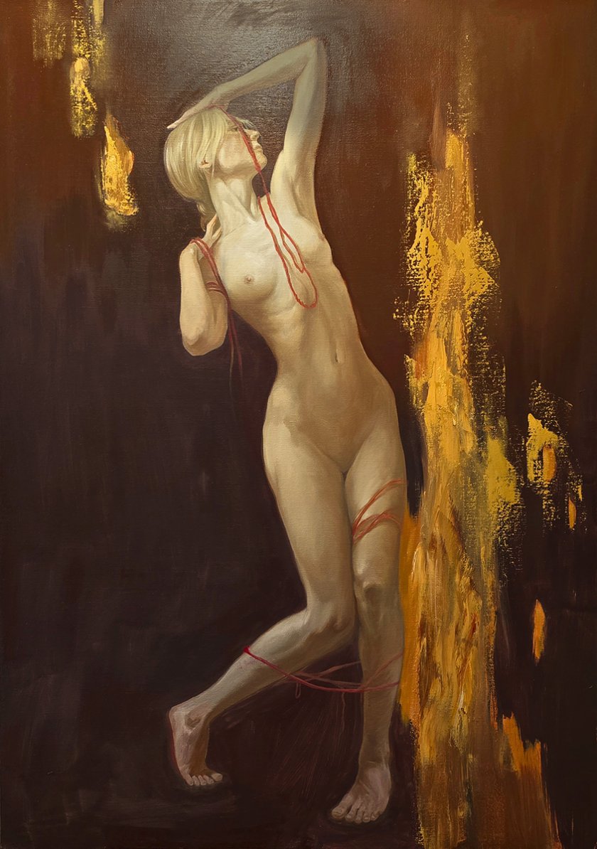 Младият художник Костадин Жиков се вълнува от тематиката за сливане на полярностите. Светлина-мрак, материя и дух, мъжки и женски принцип – цялата Вселена е изплетена от тези противоположни сили, а задачата на индивида, и в частност на създателя, е да разгадае тази загадка, да разплете нишките.