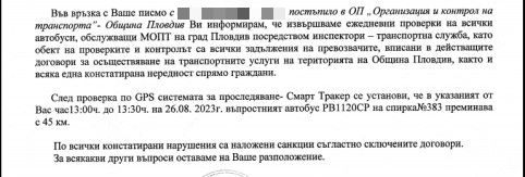 Там се декларира още, че всекидневно от общинското дружество се правят инспекции на всички рейсове, обслужващи Масов обществен пътнически транспорт на град Пловдив. По всички установени нарушавания са наложени наказания според подписаните контракти.