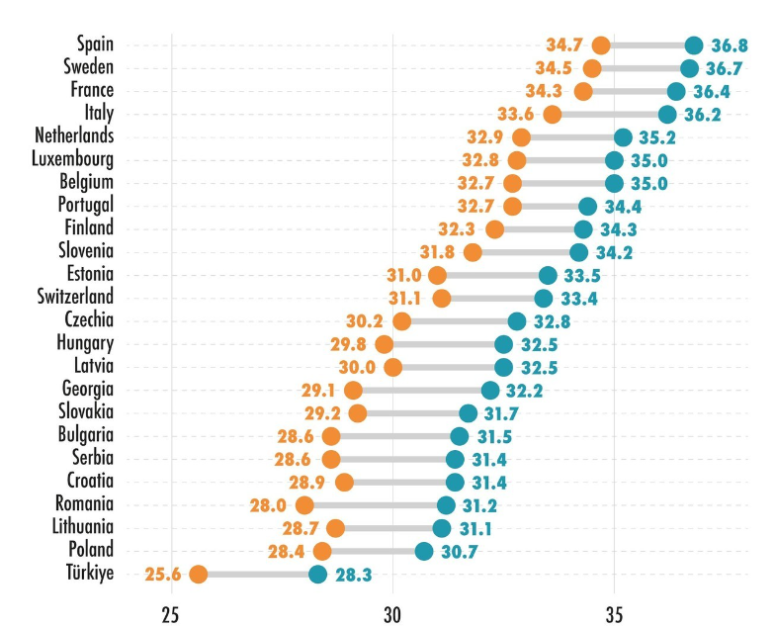 Шведите надлежно 34,5 години за дамите и 36,7 за мъжете. Последните в класацията, Испания, са с съвсем същите индикатори.