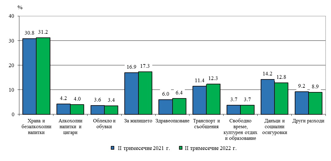 Спрямо второто тримесечие на 2021 година относителните дялове на разноските за храна и безалкохолни питиета, жилище и опазване на здравето нарастват с по 0,4 процентни пункта, а на разноските за превоз и известия - с 0,9 процентни пункта. Делът на разноските за алкохолни питиета и цигари и за облекло и обувки понижава с по 0,2 процентни пункта.