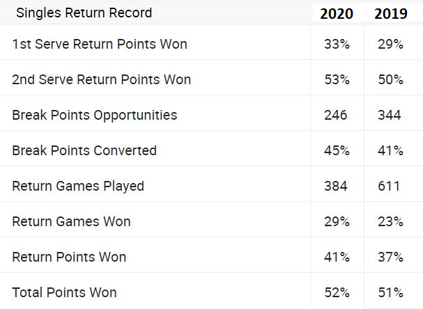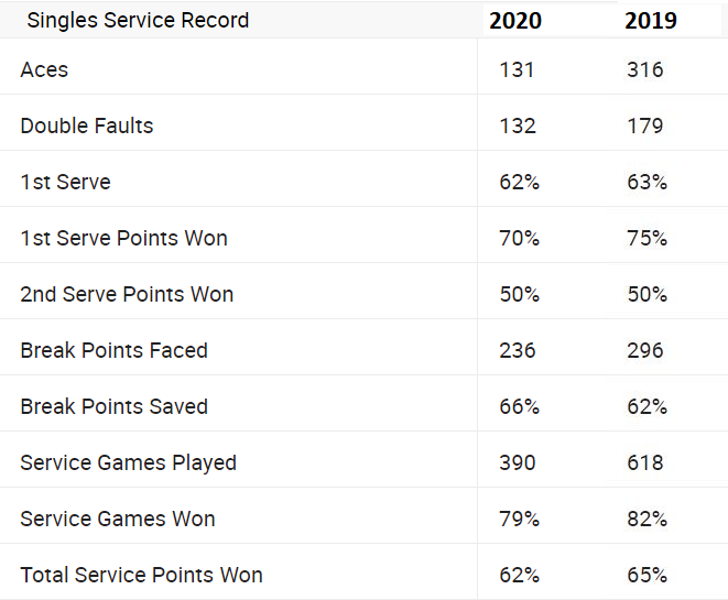 За сметка на това обаче статистиката приказва за по-колеблива игра на сервис. При % на вкаран първи сервис разлика съвсем няма. Така и е при точките, извоювани на втори сервис, които се резервират 50%. Спад обаче има при точките на първи сервис – от 75% през 2019-а на 70% през приключилия неотдавна сезон. Това води и до намаляване в извоюваните сервис геймове, които през 2020-а са 79%.