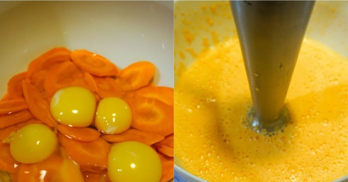 Обелете и изплакнете един огромен или два междинни моркова. Нарежете ги на пръстени и прехвърлете в купа на пасатора. Разбийте яйца там. Налейте растително масло.