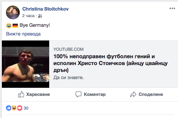По-малката щерка на Христо Стоичков - Христина, се пошегува с Бундестима след резила против Южна Корея (0:2). Малко откакто международните първенци сдадоха купата в Русия, щерката на най-великия български футболист пусна емотикона със смеещо се дребосъче, знамето на Германия и надпис " Bye Germany ". Отдолу Христина разгласява именитото видео със своя татко от САЩ'94.