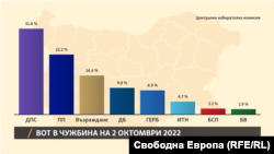 Кой къде завоюва по света На 2 октомври Движение за права и свободи за втори следващ път стана първа политическа мощ измежду българите в чужбина. Движението завоюва 31,8% (54 520 гласа) от вота зад граница като съществена част от тези гласове по традиция пристигнаха от Турция . Там партията на Ахмед Доган записва 51 905 гласа. Този резултат беше с над 33 000 гласа по-малко от поддръжката на Движение за права и свободи в Турция на 14 ноември 2021 година