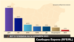 На 14 ноември 2021 година гласовете зад граница отредиха първо място на Движение за права и свободи пред " Продължаваме промяната " (ПП), " ИТН " (ИТН), ГЕРБ, " Демократична България " (ДБ), " Възраждане " и Българска социалистическа партия.