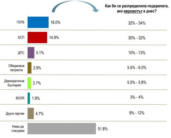 За ГЕРБ биха дали своят вот 16% от всички гласоподаватели (32-34% от гласувалите). Българска социалистическа партия би получила около 30-32% (14.9% от всички гласоподаватели). Движение за права и свободи се открояват като третият участник със несъмнено посланичество в Екологичен потенциал с поддръжка от 5.1% от общия брой гласоподаватели (10-13% от гласувалите).