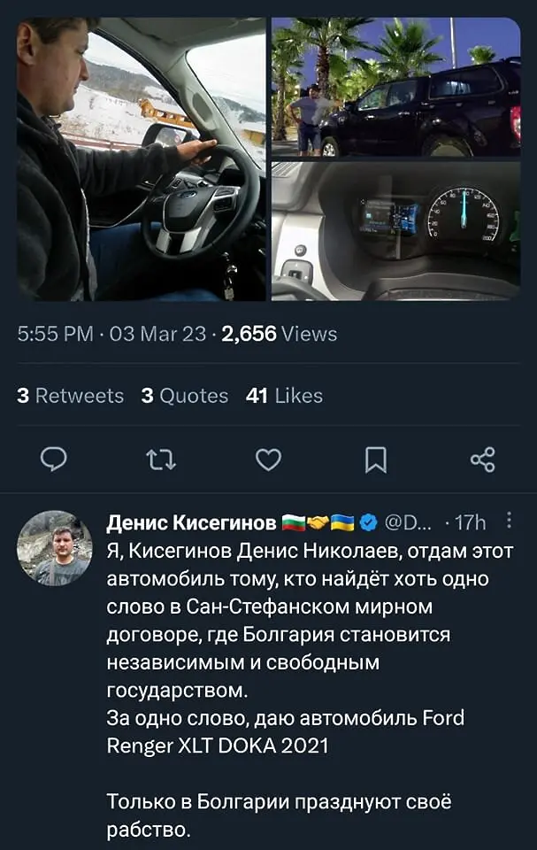 " Аз, Кисегинов Денис Николаев, ще подаря тази кола на всеки, който откри най-малко една дума в Санстефанския кротичък контракт, където България става самостоятелна и свободна страна. С една дума давам автомобила Ford Ranger XLT DOKA 2021г. Само в България честват робството си. "