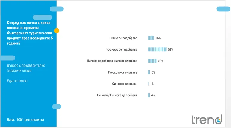 Морските дестинации не престават да са най-популярни, само че пораства и ползата към планинския, СПА и културно-историческия туризъм. Сред сферите, в които туристите чакат усъвършенствания, са инфраструктурата, качеството на обслужването и чистотата на обектите и околната среда.