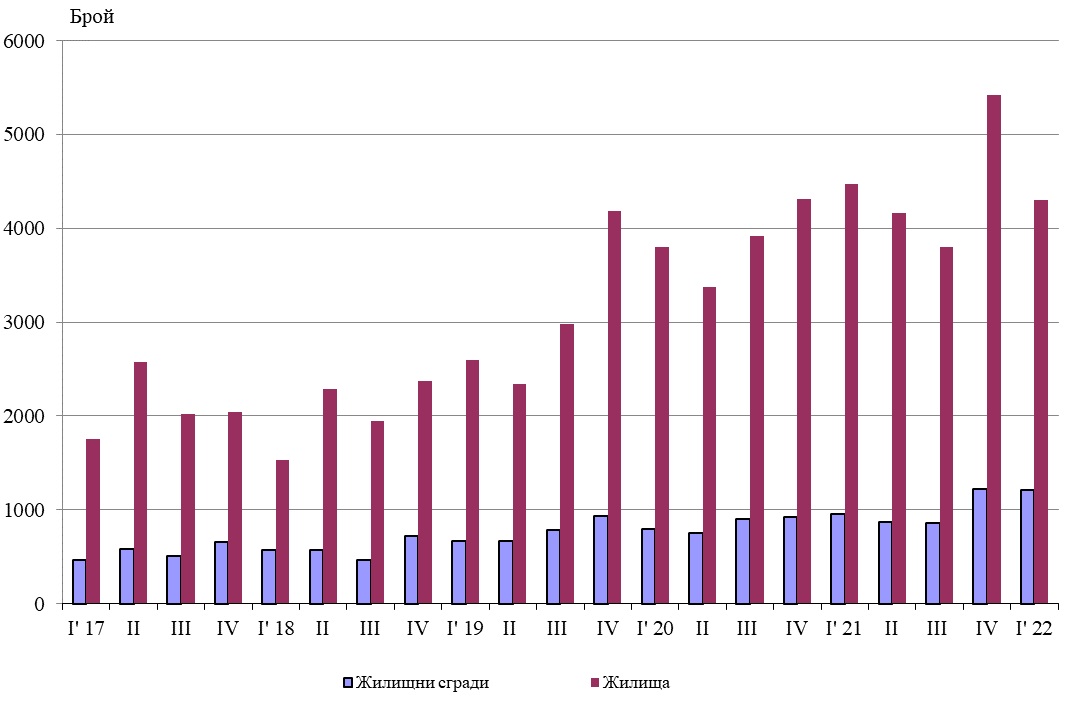 По предварителни данни на Националния статистически институт броят на въведените в употреба жилищни здания през първото тримесечие на 2022 година е 1206, а новопостроените жилища в тях са 4 299. Спрямо първото тримесечие на 2021 година постройките са с 254 повече, или с 26,7%, а жилищата в тях понижават със 174, или с 3,9% (фиг. 1).