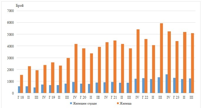 По предварителни данни на Националния статистически институт броят на въведените в употреба жилищни здания през третото тримесечие на 2023 година е 1 239, а новопостроените жилища в тях са 5 085. Спрямо третото тримесечие на 2022 година постройките са с 97 по-малко, или със 7,3%, а жилищата в тях понижават с 856, или с 14,4% (фиг. 1).